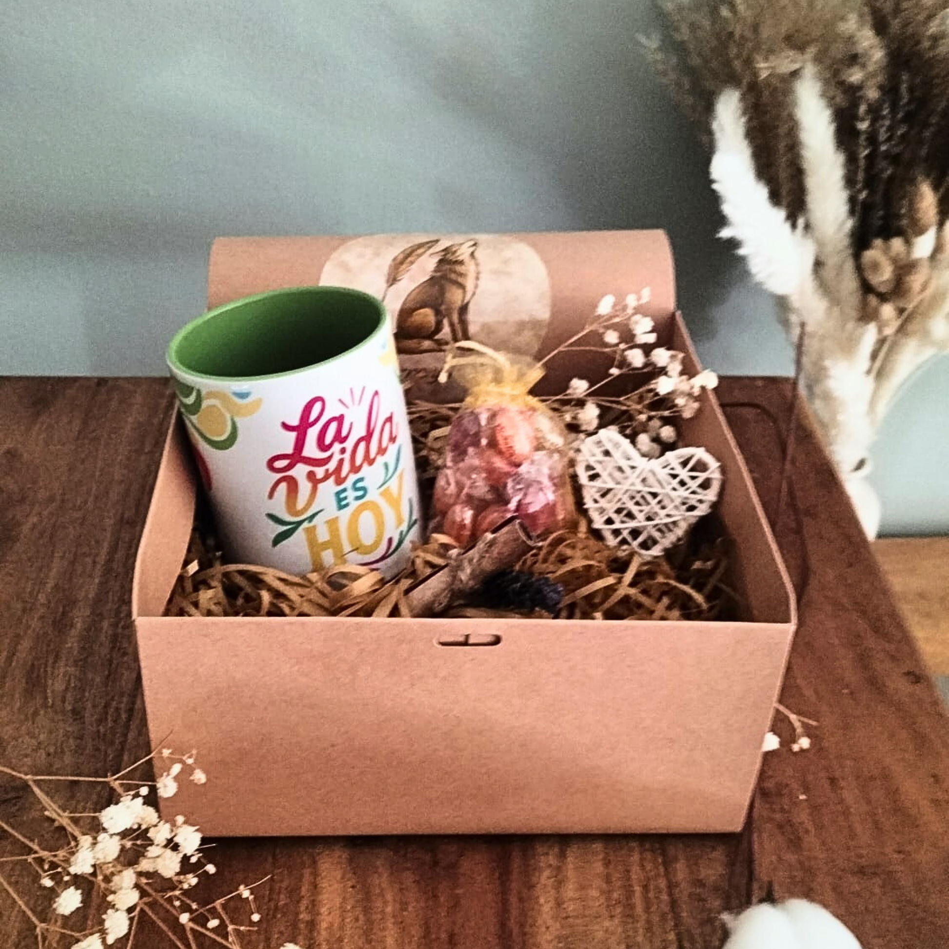 🎁 Todo envuelto con mimo en una caja con virutas naturales, acompañado de flores secas